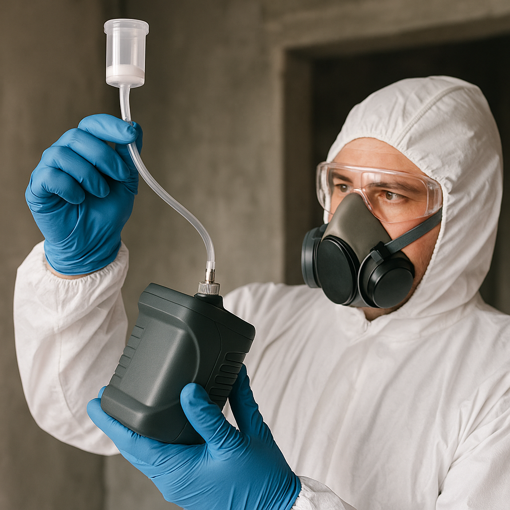 Un opérateur certifié installe une ou plusieurs pompes de prélèvement équipées de filtres conçus pour capter les fibres en suspension. Le technicien procède à :